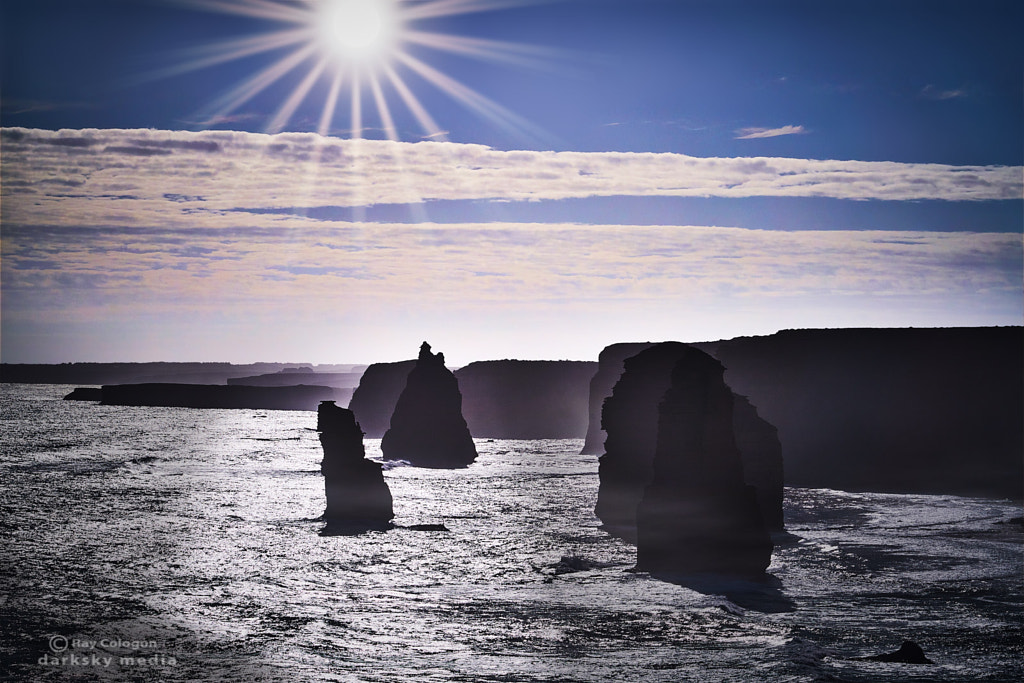 Silhouette view of the Twelve Apostles Marine National Park as viewed from the Castle Rock promontory adjacent to the Great Ocean Road in Victoria.