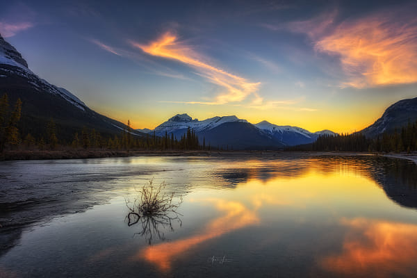 A lonely shrub was still trying to survive in the Athabasca River, Icefield Parkway, Banff.