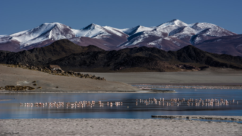 In the middle of volcanic landscapes is Laguna Grande. At an altitude of 4000 meters and plunged in the silence of the desert, lots of flamencos collaborate to create formidable prints.