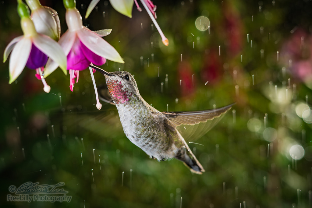 Hummingbird with pink chin visits flowers in raining day by William Freebilly photography