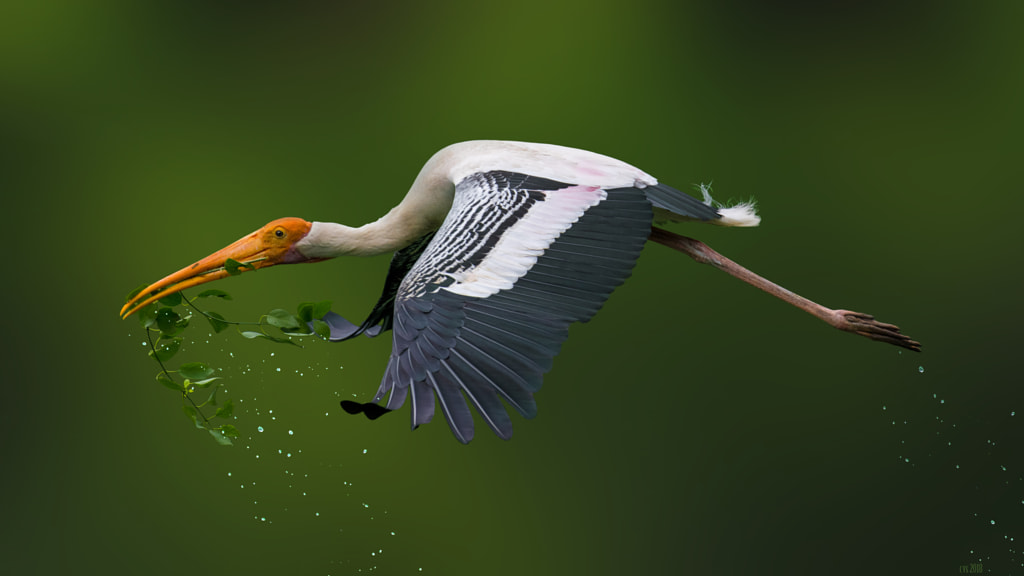A painted stork flies home with raw material for nest construction. Beginning of the breeding season begins with the construction of a nest.