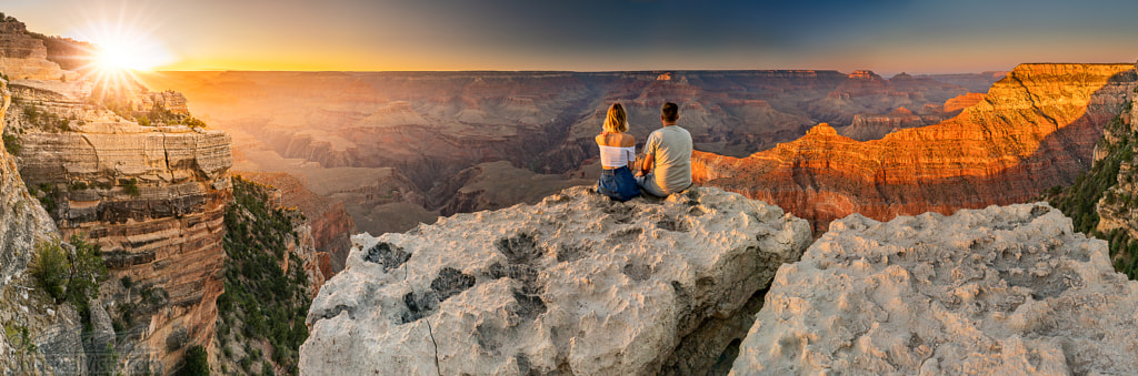 A man and a woman sit at the edge of the Grand Canyon at sunset minutes by William Freebillyphotography