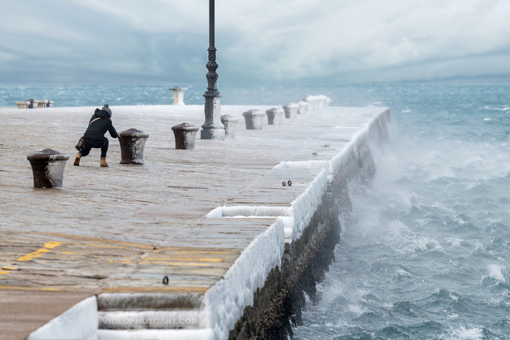 A young woman moving forward with difficulty into the wind blowing over 130 km/h (80 MPH). The waves hit vigorously the dock and the water, cooled down by extremely low temperature, freezes on contact with the icy air. The Bora is a wind that blows from the mountains into the Gulf of Triest, Italy. It blows intermittently with gusts that can occasionally be very strong as throughout the last days.