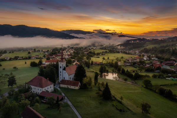 Foggy summer sunrise in Lovrenc na Pohorju, Slovenija