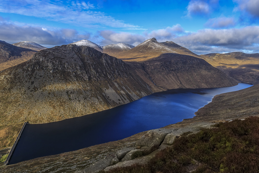 Another view of the Ben Crom reservoir from the slopes of Slieve Binnian with the snowcapped peaks of Loughshannagh, Meelbeg, Meelmore and Bearnagh in view.