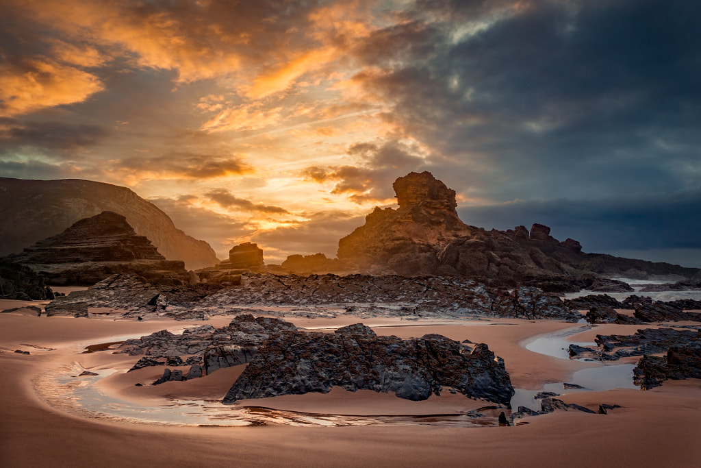 Join me on My Facebook Page We have spent several weeks in Algarve this December. I was driving and walking around on the different picturesque beaches, but Praia do Castelejo is probably my favorite beach in Algarve. I just love this a bit extraterrestrial view from the first glance. That day I was just checking it as a new location and hoping to find something interesting before the sunset. I knew there should be something as I checked the site first on Google Maps. That day the weather was changing from warm and calm to rainy and stormy. The massive cloud was moving from the ocean. When I got there, I understood that, first, the light is just fantastic, the second, I was so late to search for the composition. I ran as fast as I could to these rock formations. Five minutes later everything was done. The light was gone. But I got my shot! What a crazy luck!