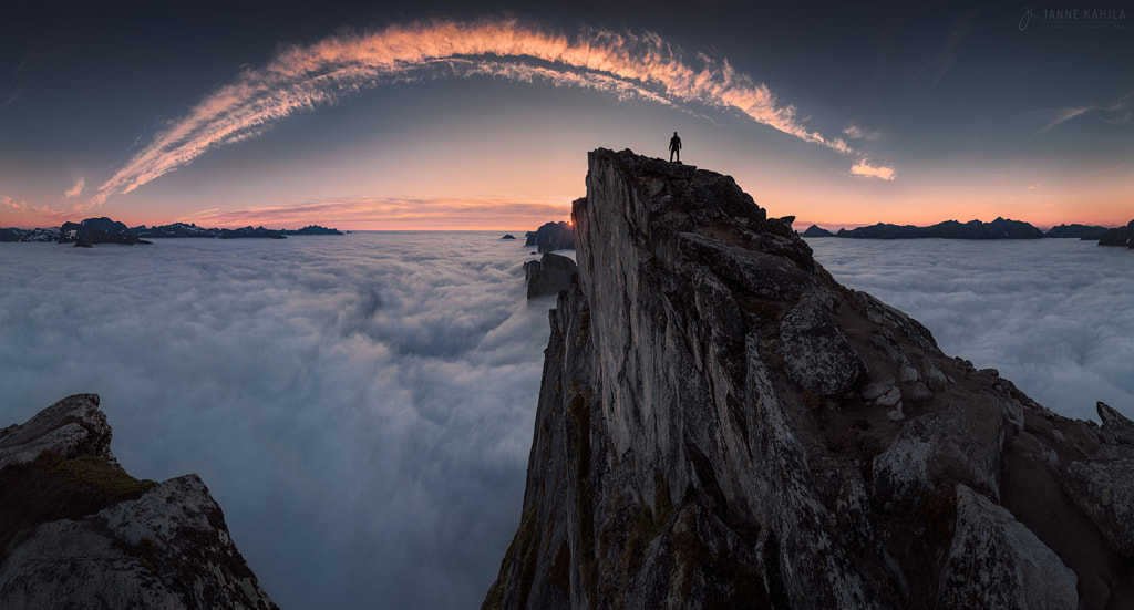 Website | Facebook | Instagram This is a self portrait taken from 640m tall iconic mountain peak Segla. We started the hike with low clouds and zero visibility but ended up seeing the midnight sun from one of the greatest locations in Northern Norway. I hope at least a small share of the awesomeness we witnessed uo there is conveyed in this photo. To see the view from the opposite side of the Segla peak, check out my previous upload Midnight Reds. This is a panorama of eight verticals so the field of view is well over 180 degrees.