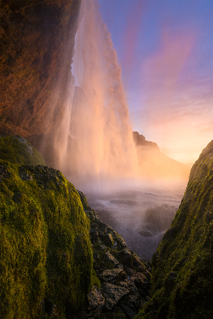 Vibrant sunset colours and light, caught up in the mist of the towering Seljalandsfoss, on the south coast of Iceland.