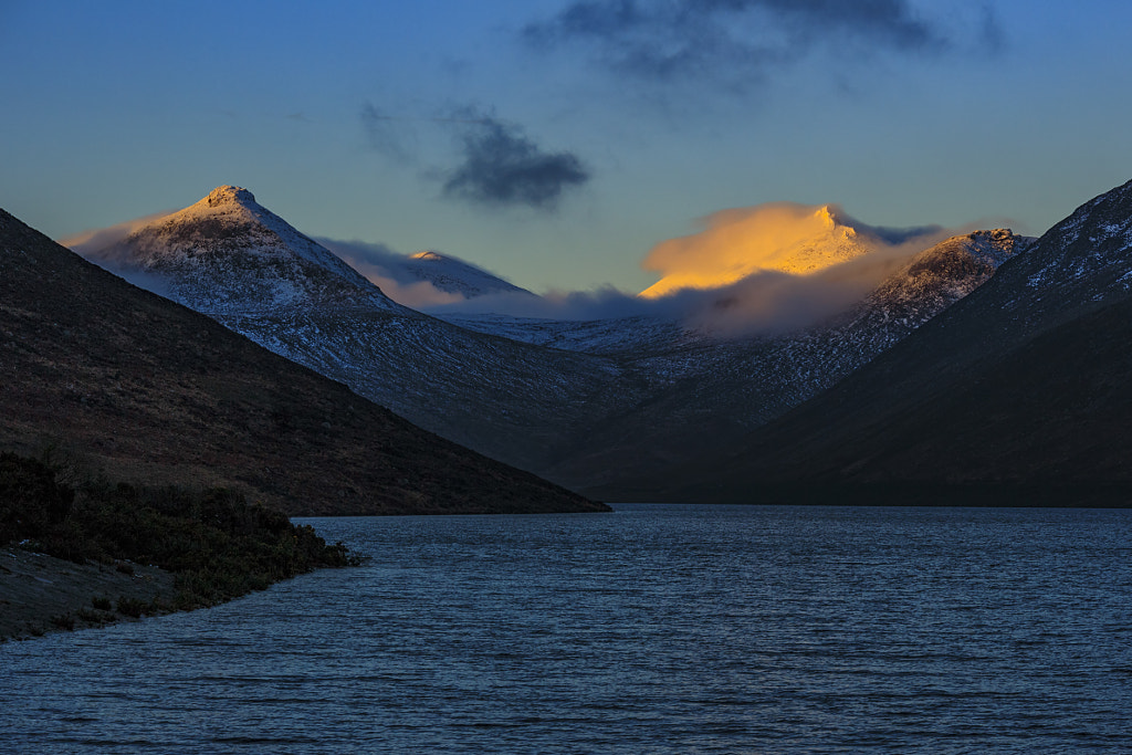 Another shot from the Silent Valley reservoir of the late afternoon sun reflection on the snow covered mountains of Doan, Meelmore and Bearnagh, as well as turned the mist and clouds red.