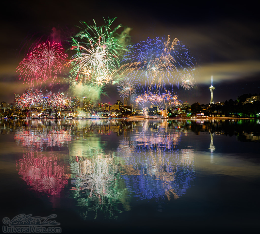 Seattle skyline and RGB fireworks with reflections by William Lee