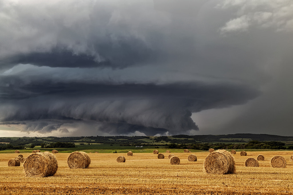 Dangerous supercell thunderstorm, complete with large distant tornado, over the freshly harvested wheat fields of South Dakota. Incredible to see in person and photograph! Check us out at www.silverliningtours.com !