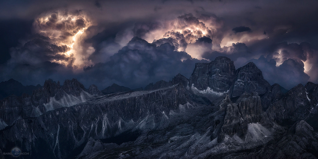 Panorama image of a thunderstorm seen from Rifugio Lagazuoi in the Italian Dolomites.