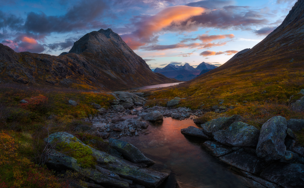 Sunrise Vengedalen, Romsdalen, Norway. Pano from two 15mm horizontals. Sorry for re-uploading – the first version lacked some contrast.