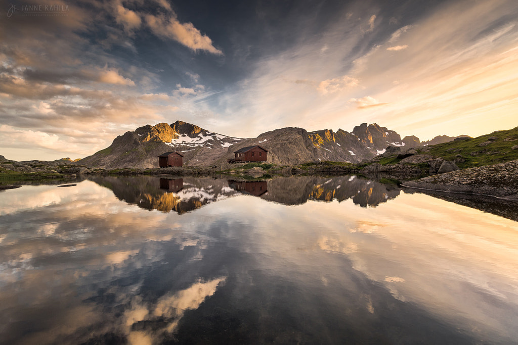 Website | Facebook | Instagram After a long hike to Hermanndalstinden, the highest peak in west Lofoten, we set out camp near next to Munkebu huts. The sunset turned out to be really nice but I was way too tired to hike to some higher vantage point so I decided to shoot the reflections of the huts in the still mountain lake. I have maybe a hundred different compositions but this simple symmetrical reflection worked surprisingly well since the clouds seemed to form nice diagonal leading lines from every corner.