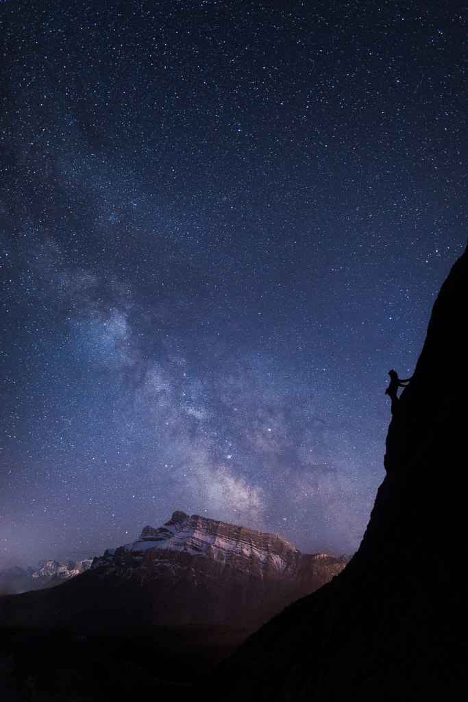 One climber and one hundred billion stars on a stunning night in Banff National Park. Model: Mike Stuart from Canadian Alpine Guides Bankhead Buttress, Cascade Mountain.