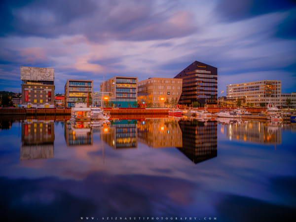www.aziznasutiphotography.com Picture hasbeen taken at 00:47 AM. Brattøra is an artificial island in the city of Trondheim in Trøndelag county, Norway. The 0.485-square-kilometre island is located at the mouth of the river Nidelva just north of the city centre, west of Nyhavna, and south of Trondheimsfjord.