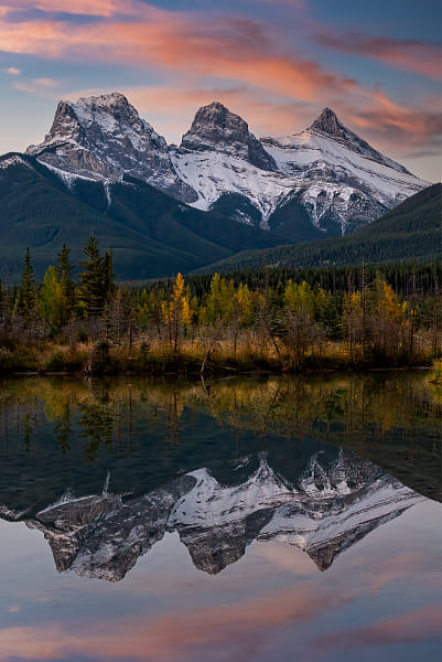 A close up reflecting the beauty of the Three Sisters in the Canadian Rockies.