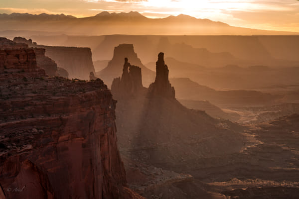 Never understood why there is the district of Island in the Sky in massive Canyonland National Park. It was not until the morning I took the sunrise shot at famous Mesa Arch, witnessing the sunlight coming from snow-capped Le Sal mountain and lighting up the dense fog in the valley, gradually unveiling the meandering canyon and rocky cliff with layers of timeless wonder and eternal change of earth! Indeed the island in the sky!