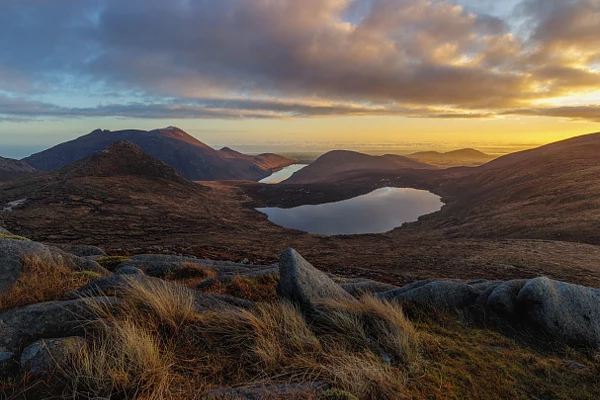 Looking towards Lough Shannagh with Slieve Binnian far left, and the Irish sea in the distance.