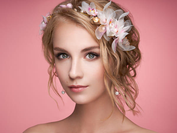 Young blonde woman with tiara on her head. Blonde girl with elegant and shiny hairstyle. Beautiful model woman with curly hairstyle. Care and beauty hair products. Perfect make-up