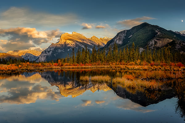 Mount Rundle reflecting in Vermillion Lake on a beautiful Autumn evening in Banff National Park.