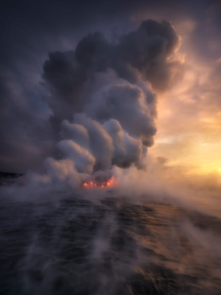 Lava flowing into the waters of the Pacific Ocean at sunrise. No matter how many times I have photographed the sporadic lava flows on Hawaii’s Big Island, I’ll never not be fascinated by watching an island grow right before my eyes… followed by watching my waistline grow before my eyes while eating some of my favorite food in the world. Hawaii never disappoints. This image shows several fingers of lava flowing underneath a large plume of steam and gas while the molten lava underneath the water breaks away, floats, then creates steam on the surface of the ocean. It’s a truly otherworldly sight to behold. You can learn how I create my images at www.ryandyar.com 👍👍 Thank you for taking a look at this photo.