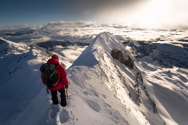 Scenic winter hiking adventure, ridge descent from mount Triglav, Julian Alps, Slovenia.