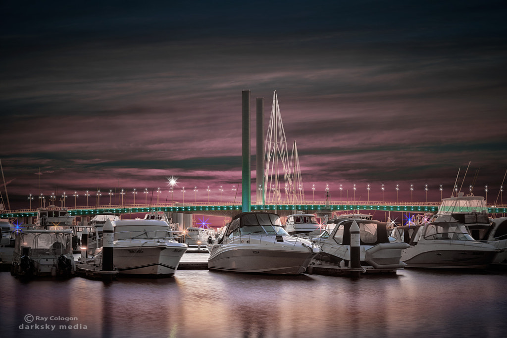 View of Melbourne’s iconic Bolte Bridge just after sunset, taken looking west from the south promenade of Victoria Harbour at Docklands.