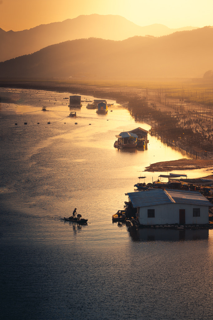 Long workdays for the fishermen of China, Living and working on the water 365 days a year. Here is two fishermen coming home as the sun is setting in the distance. www.airpixelsmedia.com