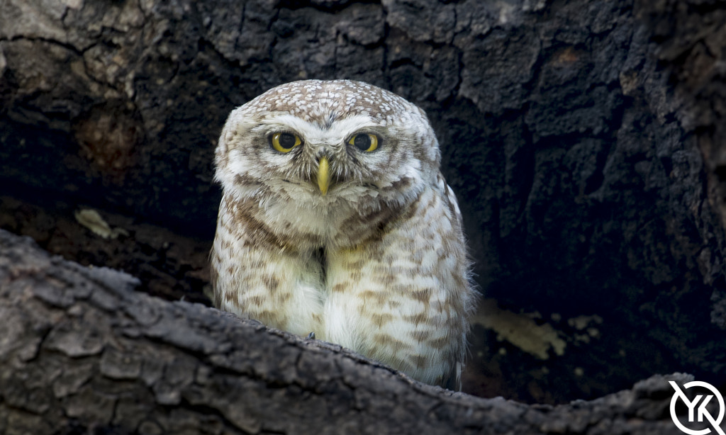 A spotted Owl guarding his nest while female is inside hatching eggs.