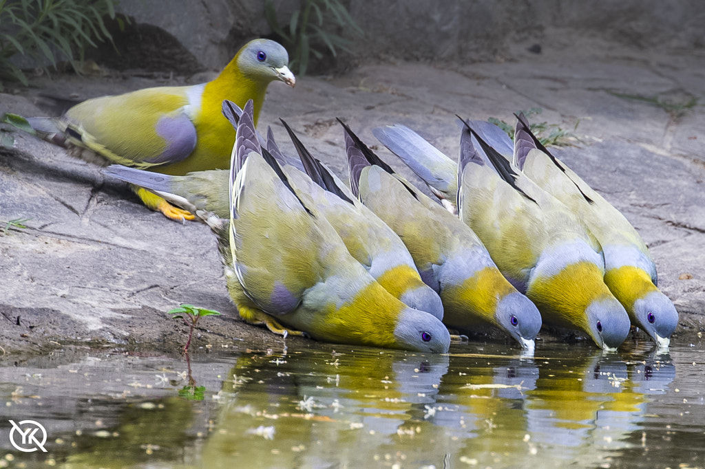 A flock of Yellow footed Green Pigeon having water from a lake in Delhi. They generally do not come down but for water only. Summer has arrived in Delhi temperature around 40 Degree. Its hot for the birds also.