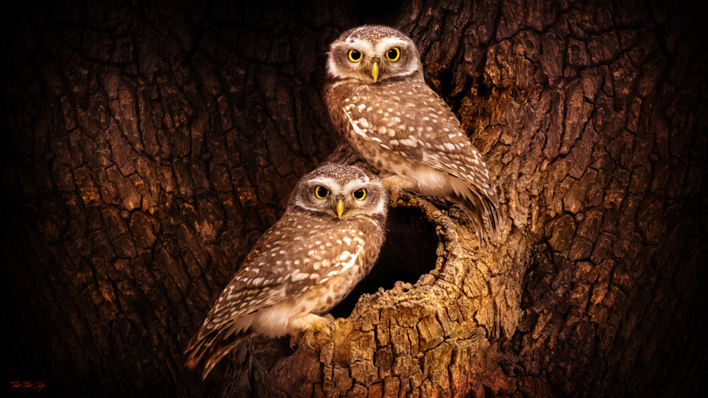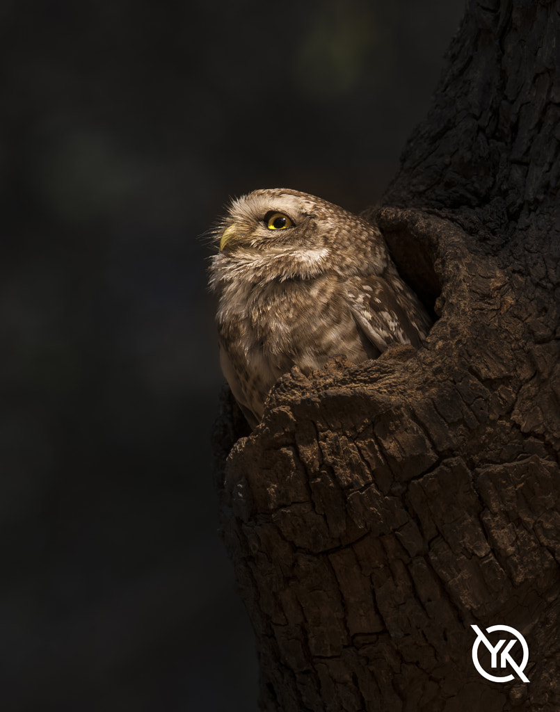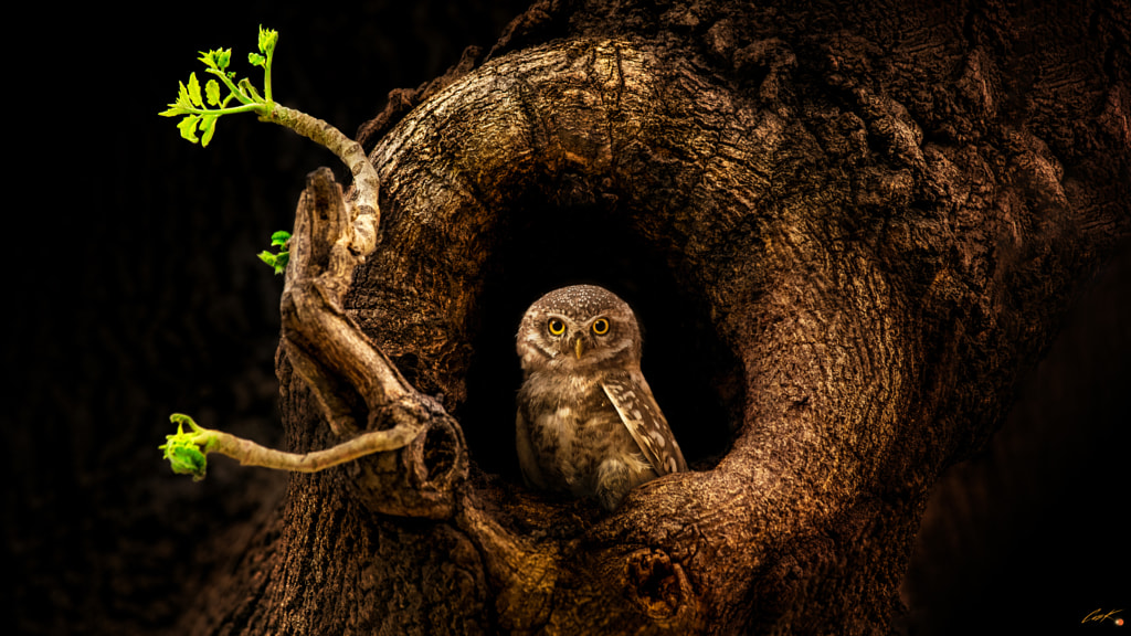 A Spotted Owlet fiercely guarding its nest in the forest.