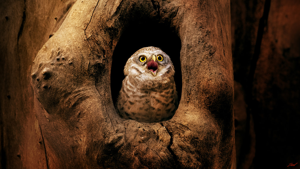 He’s the sentinel guarding the nest. You have to cross his defence to get anywhere close to the nest. A spotted Owlet sends out a message.