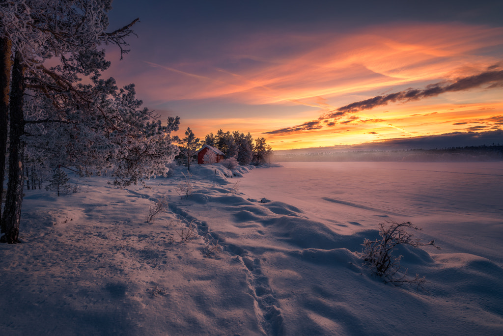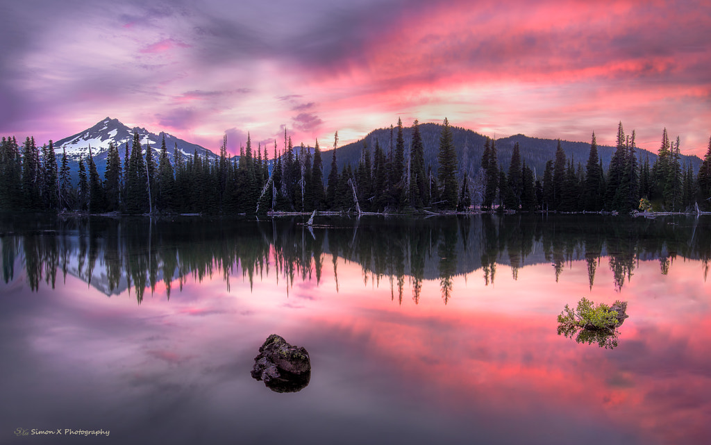 Re-edited from the earlier post. The rising sun in wee hours of early morning wakes up the sleeping sky. The solar wind blows the clouds up into beautiful flying ribbons forming perfect reflections in the Sparks Lake.