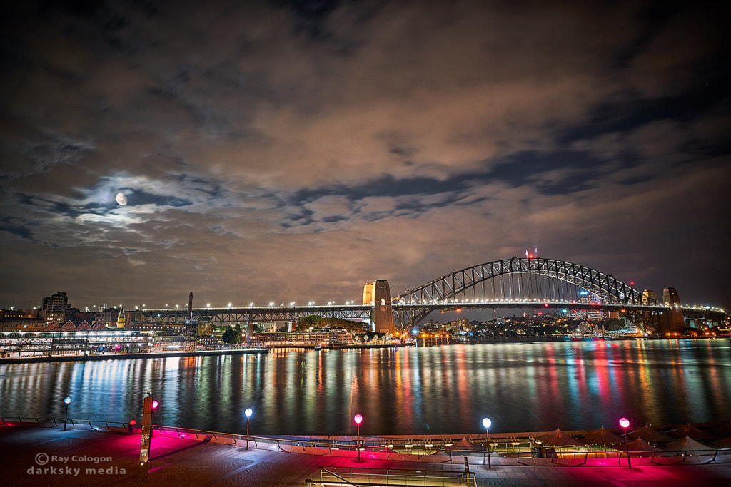 In the stillness of the midnight hour, the Sydney harbour and bridge shimmer under the moonlight and the gleaming illumination of a thousand lamps.