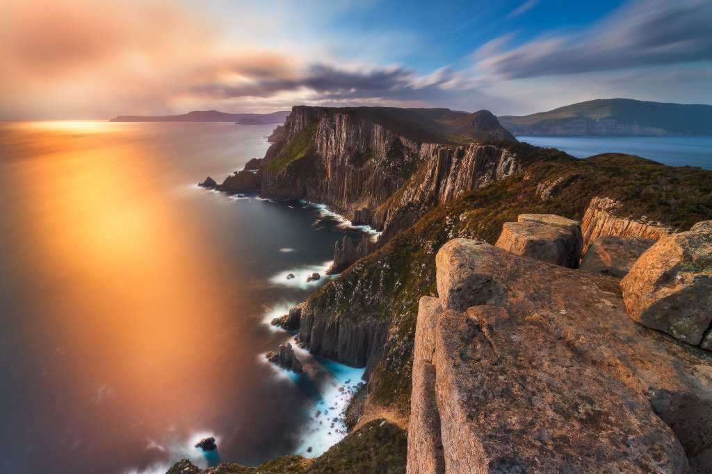 Tasman National Park This is the view from the Blade at the end of a 15km walk from the car park. Well worth the effort and an overnight stay! In the distance, sunset light is diffused by smoke haze a couple of hours early.