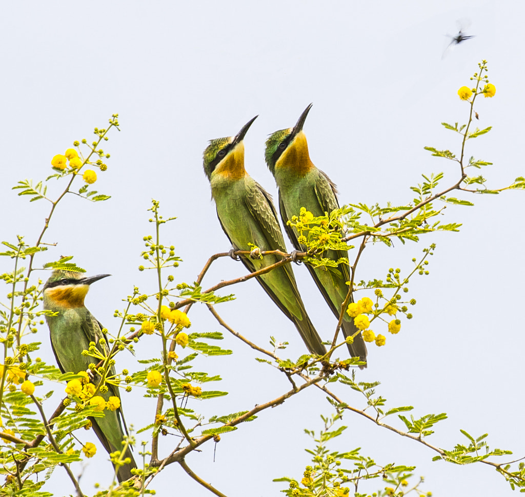 Three yellow neck Beeeater watching a flying Bee and thinking about food.