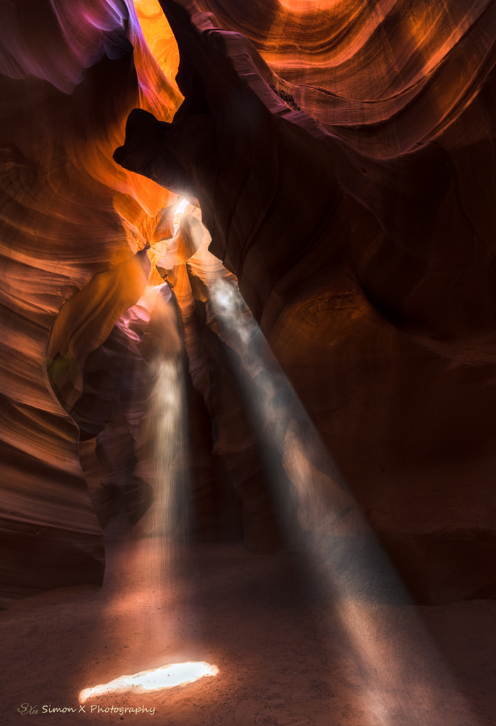 ———————————————————– I did not know what to make out of it when the Navajo guide told us ” The light is here today ! “. Well, the light is indeed here, magically not one but a pair of light beams showed up at few minutes before noon. The dusts inside the dark canyon accentuated the light beams, making one looking like a waterfall and the other a vortex.