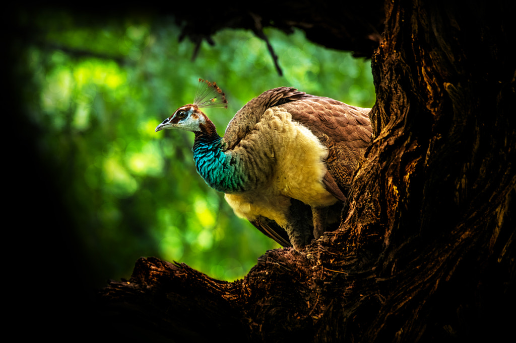 A Peafowl emerges from her tree hideout. An emerald forest beckons !