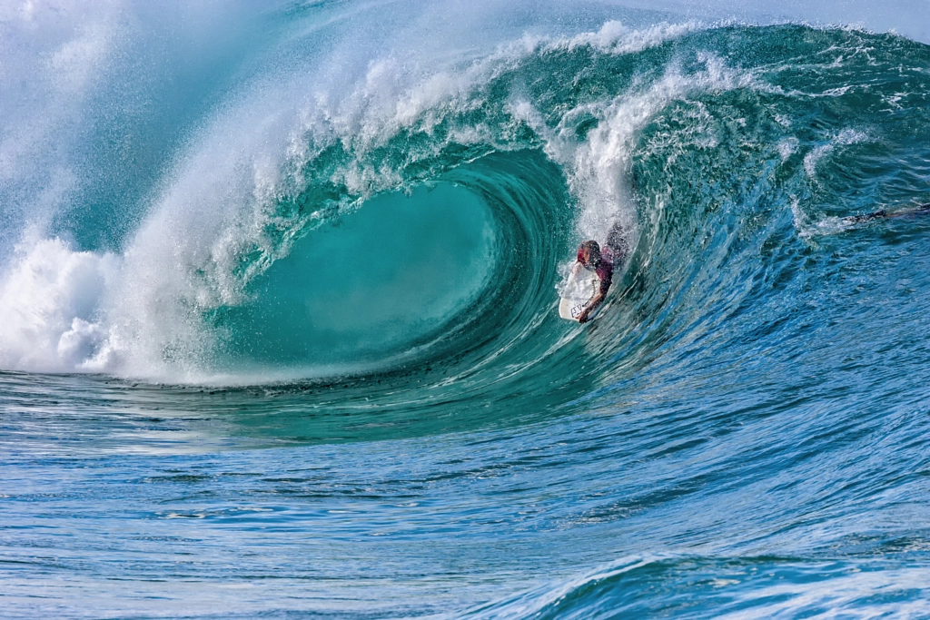 Bodyboarder dropping down the face of a perfect wave at Waimea Bay, Hawaii