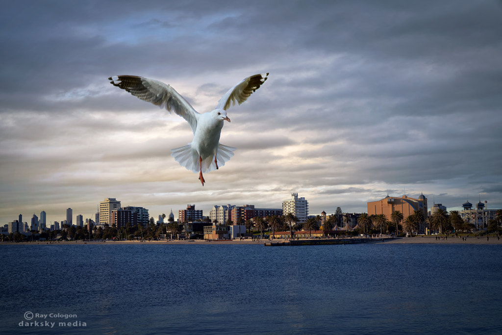 A southern gull with a missing toe on its one remaining leg transcends its affliction, lifting valiantly into the air to forage for food among the rocks and tussocks of the St Kilda Marina foreshore reserve in Melbourne.
