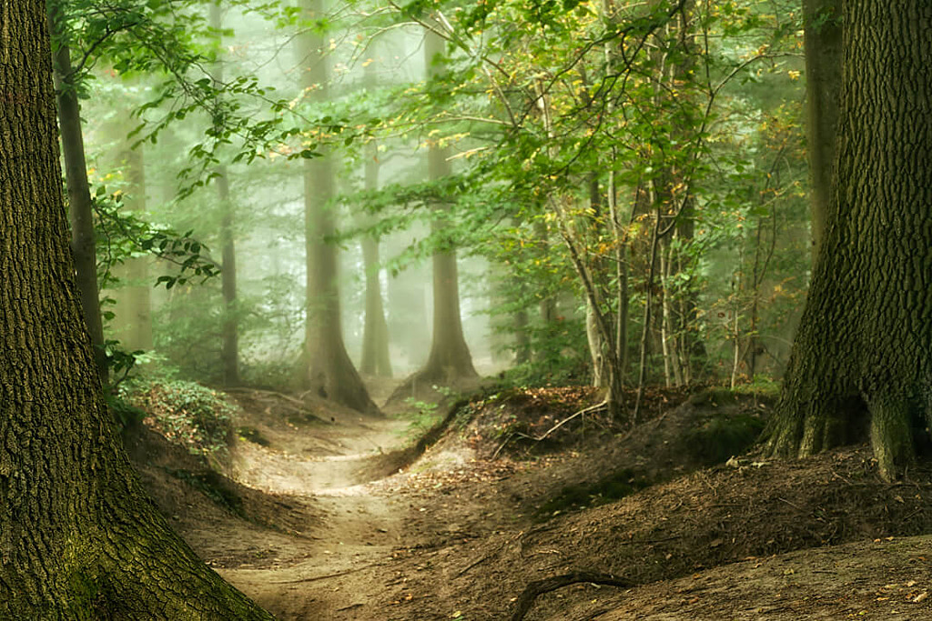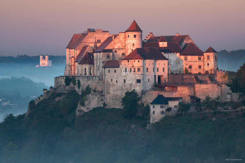 The morning mist and fog dances around the church and over the ridge in the moments just before sunrise. Jamnik, Slovenia.
