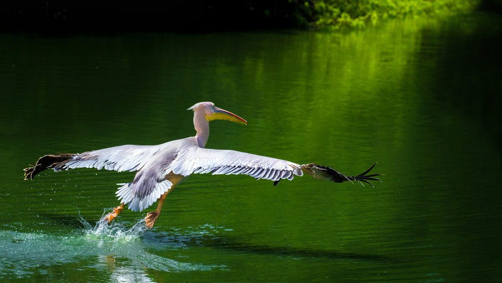 A Rosy Pelican on takeoff roll. and the runway gets lit by a divine reflection