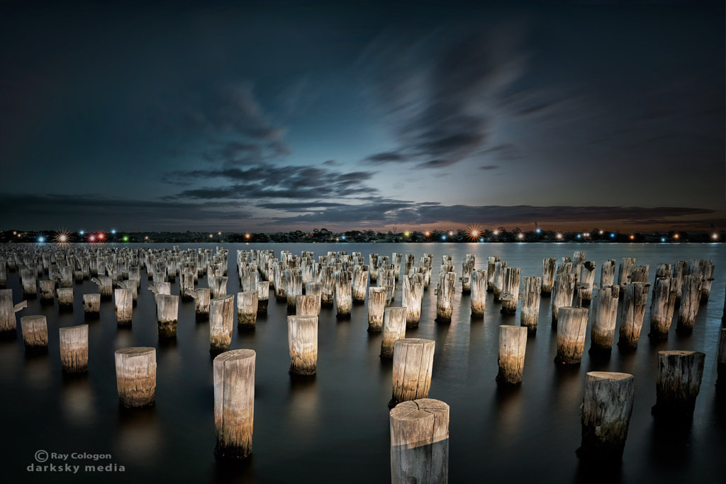 Stack/composite of multiple long exposure images featuring the decaying pylons of Princes Pier on Port Phillip Bay, a relic from when the pier was used extensively for troop movements during WW2.
