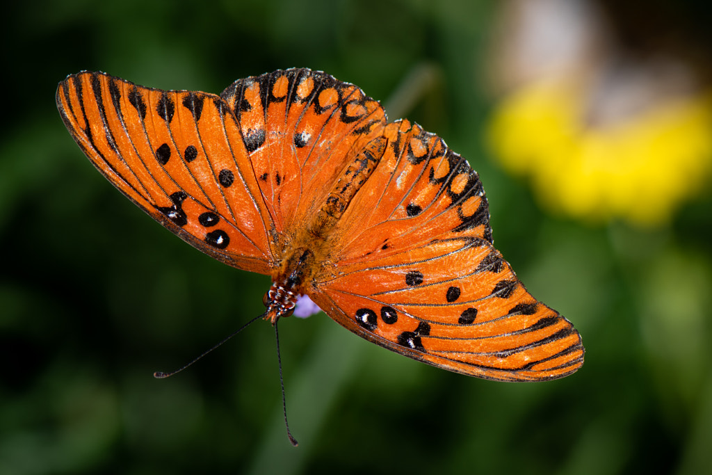 A beautiful orange Gulf Fritillary butterfly with fully extended wings captured by my macro lens on a sunny spring day. Enjoy.