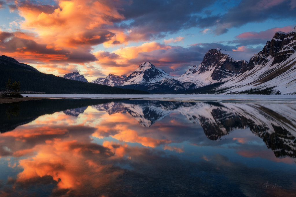 日出时分摄于加拿大班芙国家公园公园的弓湖(Bow Lake)。 凌晨4点多一个人从路易斯湖开车前往班芙国家公园的弓湖。运气真的是太好了,日出的红云如火焰般绚烂。五月底的弓湖刚刚开始冰雪消融,平滑如镜,水天之间让人分不清!