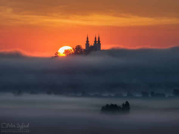 Foggy sunrise behind Sveta Trojica, Slovenija