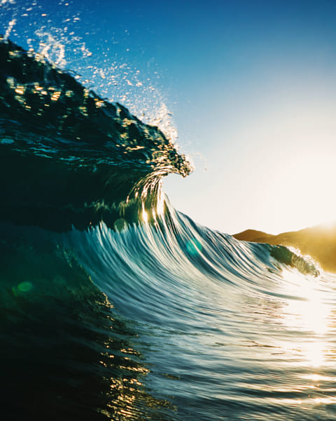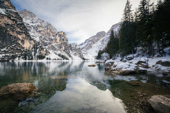 An over/underwater image of Moraine Lake and the Ten Peaks shot on the Canon E5 with AquaTech EDGE housing.