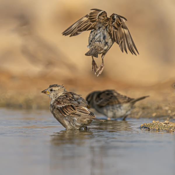 Sparrows are bathing in a puddle