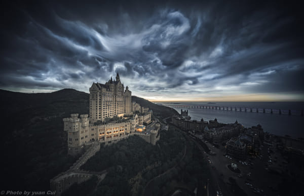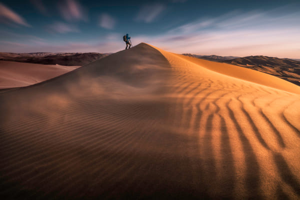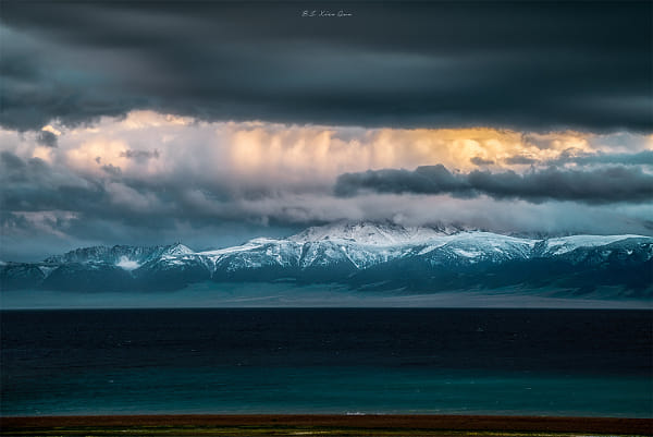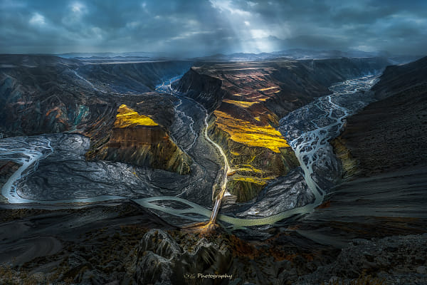 Thousands of winding rivers cut through the canyon like interconnected spider webs. The fast moving clouds created an opportune moment when the light beams focused on the multi-colored rock formation. The distant mountains shrouded way up above the clouds are Tianshan mountain range, at 24,000ft. The photo was selected as the Top100 images for 2020 Landscape Photographer of the Year Award.